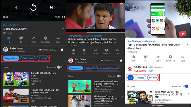 Báo cáo cho biết một số người dùng Android tại Ấn Độ đang được thử nghiệm một tính năng mới của YouTube, nơi cột Up next hiển thị các “bong bóng” để lọc các video được hiển thị. Hình ảnh được gửi từ những người thử nghiệm YouTube cho thấy Google đang thử các phương pháp triển khai khác nhau của tính năng mới này.