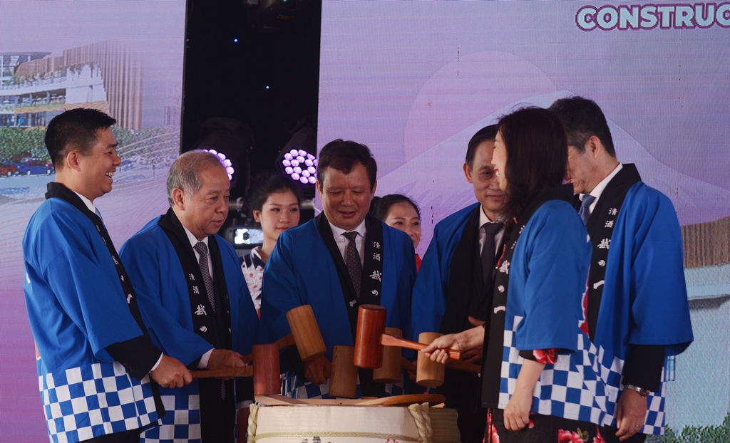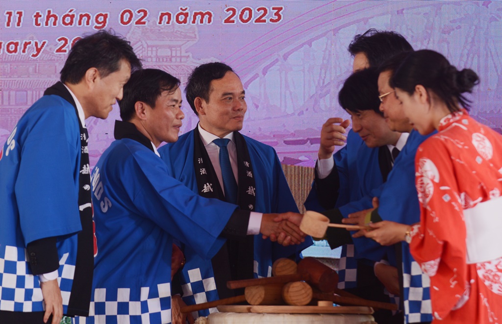 Bí thư Tỉnh ủy Lê Trường Lưu và các đại biểu thực hiện nghi thức truyền thống của Nhật Bản mang ý nghĩa may mắn sau khi bấm nút khởi công