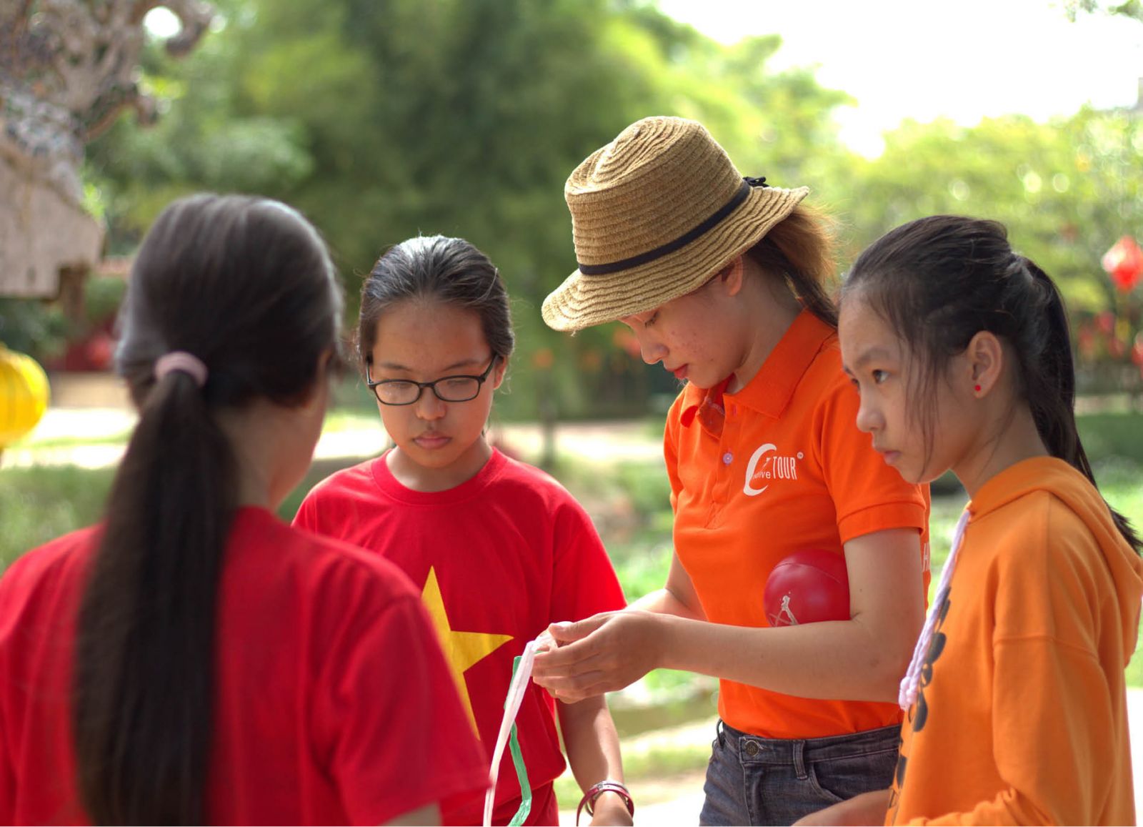 Thành viên nhóm dự án du lịch sáng tạo (Khoa Du lịch, ĐH Huế) hướng dẫn khách các trò chơi trải nghiệm