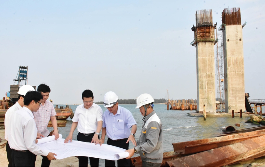 | Lãnh đạo tỉnh kiểm tra tiến độ dự án tuyến đường bộ ven biển đoạn qua tỉnh và cầu qua cửa Thuận An. Ảnh: Ngọc Minh |