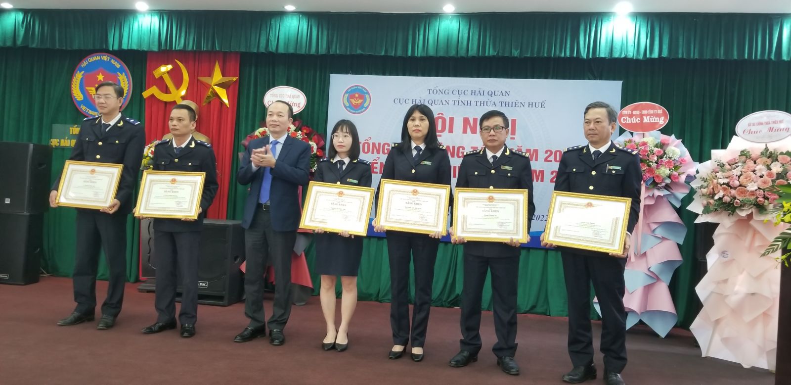 Phó Chủ tịch UBND tỉnh Phan Quý Phương (thứ ba, trái sang) trao tặng Bằng khen của UBND tỉnh cho các tập thể, cá nhân có thành tích xuất sắc trong công tác hải quan năm 2021
