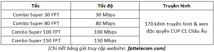 Cụ thể, với nhóm khách hàng là cá nhân, gia đình khi đăng ký lắp đặt mạng FPT mới hoặc đang sử dụng dịch vụ... đều được nâng cấp gói cước từ Super 45 lên 80mbps; các gói khác lần lượt là 100Mbps và 150Mbps. Với khách hàng là doanh nghiệp, FPT triển khai các gói cước: Super 200, Super 250, Super 400 và Super 50. Các gói cước tự động nâng cấp, người dùng không phải mất thêm phí chuyển đổi; tốc độ Download bằng Upload.
