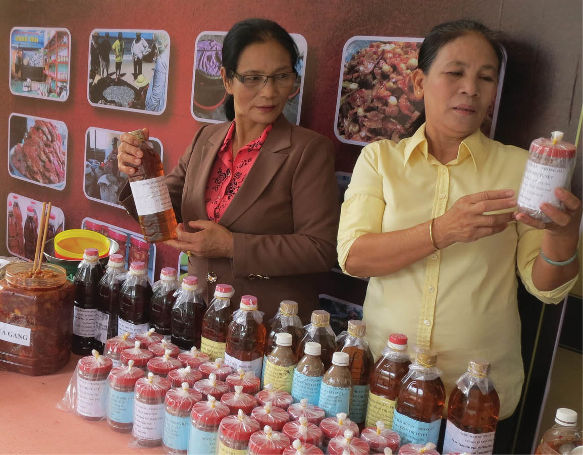 Sản phẩm mắm, nước mắm được trưng bày tại phòng trưng bày giới thiệu quảng bá sản phẩm HTX và các doanh nghiệp