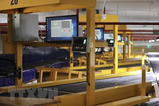 Khu vực vào mã bưu kiện, bưu phẩm của hệ thống chia, chọn tự động công nghệ Cross Belt của VietnamPost. (Ảnh: Minh Quyết/TTXVN)