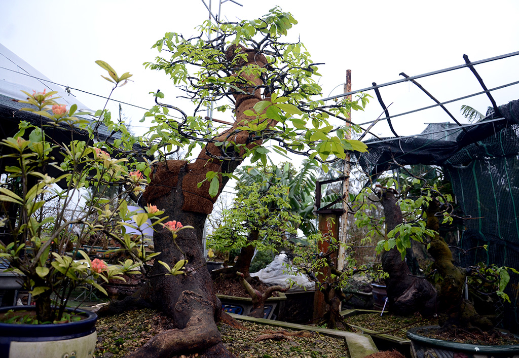 Nổi bật nhất trong vườn là hai cây “mai cụ” có tuổi thọ lên đến vài trăm năm. Gốc cây có đường kính gần 0,5m, gốc rễ kỳ quái, phải dùng chậu có thể tích gần 10m3 mới vừa bộ rể khủng của hai cụ mai.