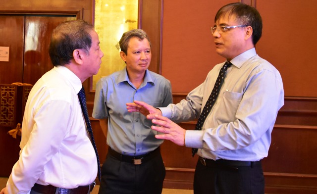 PGS-TS Trần Đình Thiên (bên phải) trao đổi với lãnh đạo tỉnh xung quanh các vấn đề liên kết vùng