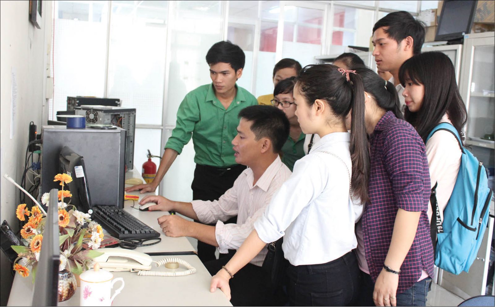 Hướng dẫn sinh viên ngành CNTT thực tập tại Trung tâm Công nghệ thông tin tỉnh. Ảnh: HueCIT