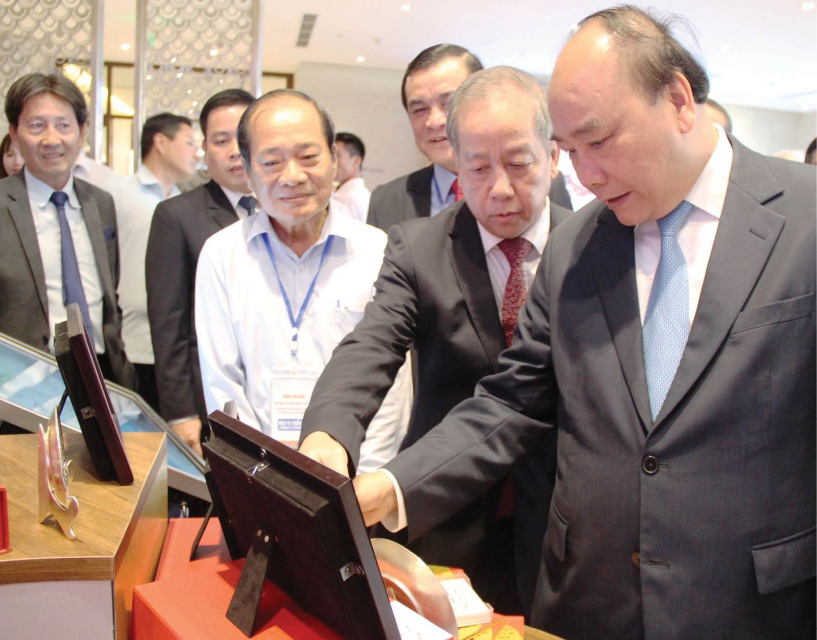 Thủ tướng Nguyễn Xuân Phúc cùng Chủ tịch UBND tỉnh Phan Ngọc Thọ tham quan không gian trưng bày của nghệ nhân Nhân dân Trần Duy Mong tại triển lãm sản phẩm thủ công mỹ nghệ Huế. Ảnh: PHAN THÀNH