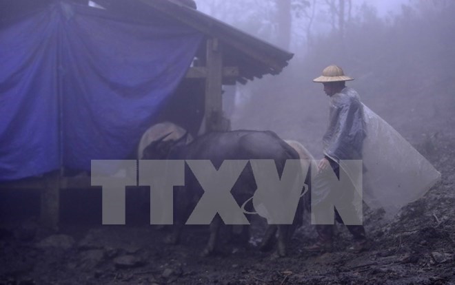 Người dân thôn Can Hồ B, xã Bản Khoang, huyện Sa Pa căng bạt che chắn chuồng trại, chủ động phòng, chống rét cho gia súc. (Ảnh: Thế Duyệt/TTXVN)