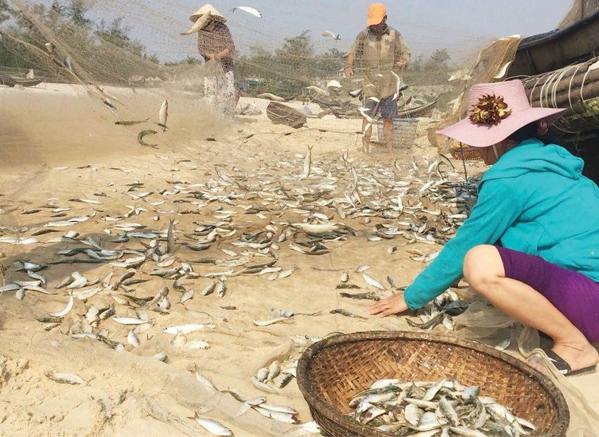| Ngư dân Ngũ Điền gỡ cá trích trên bờ |