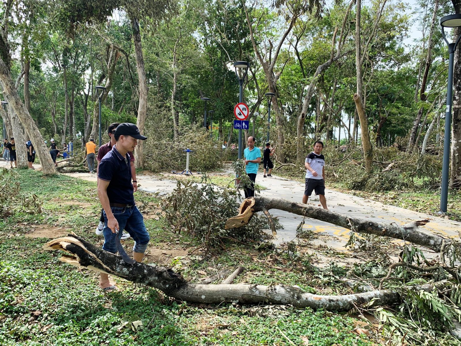 Trong khi đó, dọc theo công viên hai bên bờ sông Hương, nơi có hệ thống cây xanh được mệnh danh “rừng trong phố” cũng rơi vào tình cảnh tương tự. Ngay sau một ngày cơn bão đi qua, nhiều người đã quay trở lại tuyến đường này để tập thể dục. Thế nhưng chứng kiến hệ thống cây xanh gãy đổ nhưng chưa được dọn kịp thời, nhiều người đã cùng nhau kêu gọi chiến dịch làm sạch tuyến đường đi bộ này.
