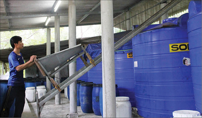 Xe đẩy tự chế giúp đưa mắm vào bồn chứa lớn
