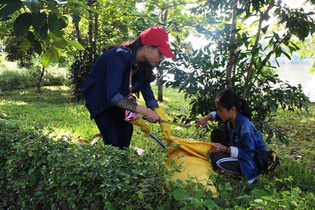 Hai bạn trẻ tham gia nhặt rác dọc theo sông Hương đoạn phía trước chùa Thiên Mụ