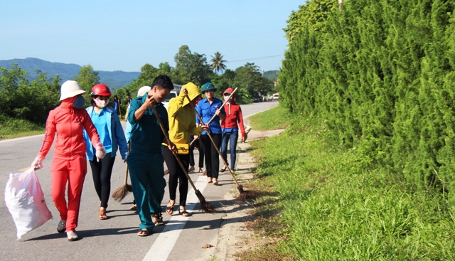 Các đoàn viên, thanh niên thị xã Hương Trà làm sạch phía trước Văn Thánh - Võ Thánh