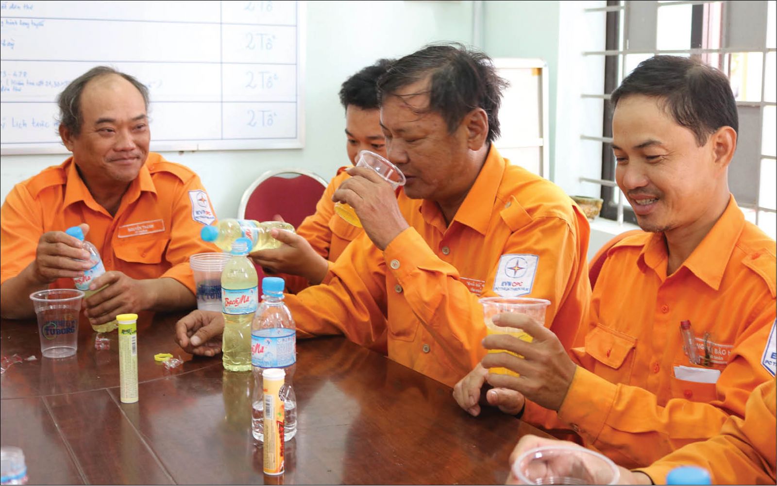 Công nhân điện tại Điện lực Bắc Sông Hương chuẩn bị vitamin C dạng nước cho chuyến đi hiện trường mùa nắng nóng