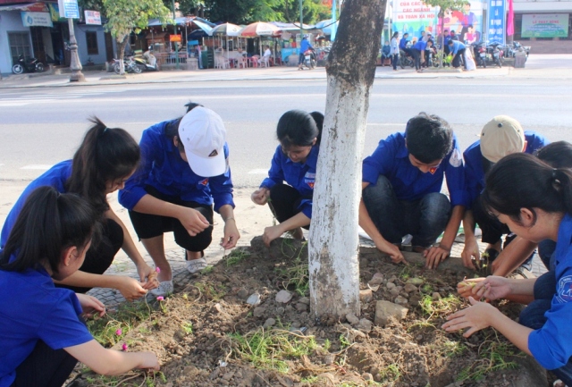 Trồng hoa trên tuyến đường Nguyễn Tất Thành ngay sau lễ ra quân