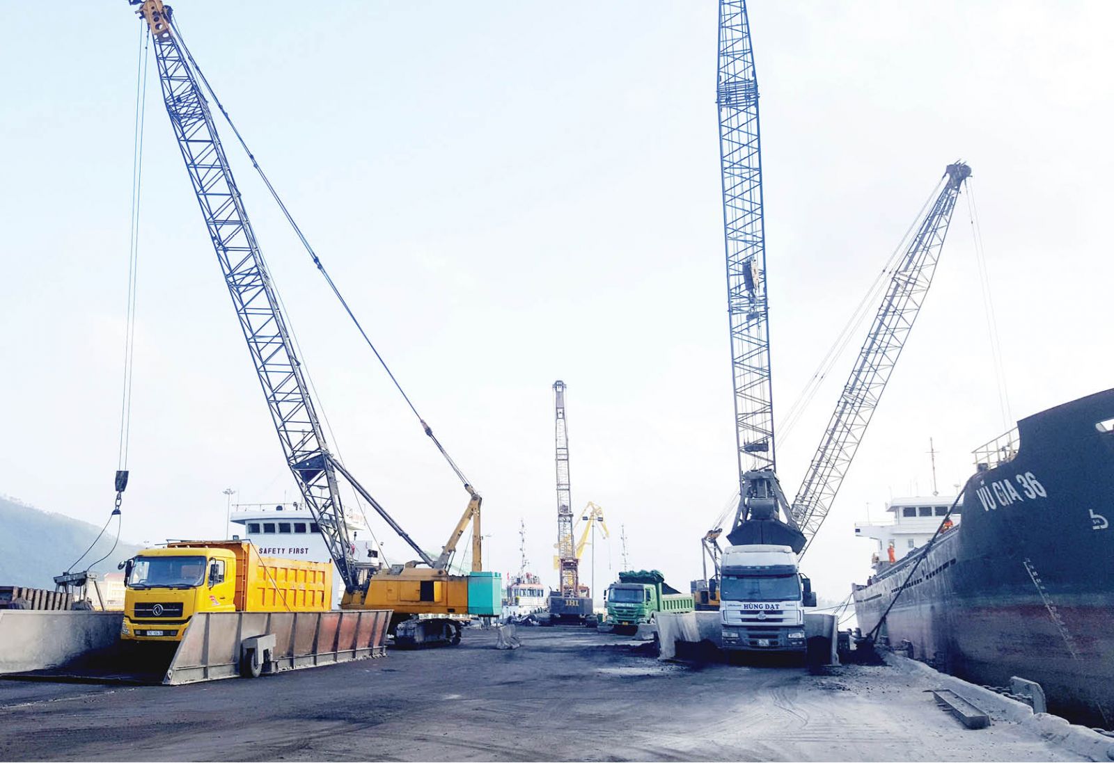 Tại cảng, tàu Vũ Gia 36 chở hơn 4.800 tấn than đã neo sát bến số 1. Các cần cẩu đang khẩn trương múc than từ tàu lên. Cách những chiếc cần cẩu khoảng 60 mét là tàu Word Swan II đến từ Nhật Bản có trọng tải hơn 42 nghìn tấn đang tranh thủ nhập nốt những chuyến gỗ dăm cuối cùng để rời bến.