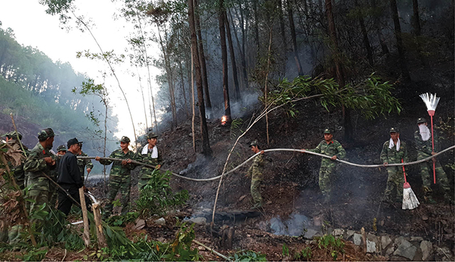Các lực lượng tham gia chữa cháy rừng thông ở Hương Hồ