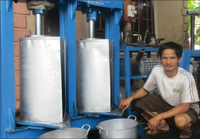Lê Hữu Minh bên máy ép dầu phụng và mè bằng thủy lực