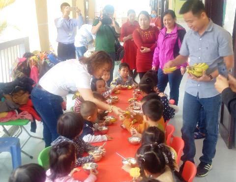 Các cháu nhỏ rất hào hứng khi được tặng chuối già lùn vào khẩu phần hằng ngày