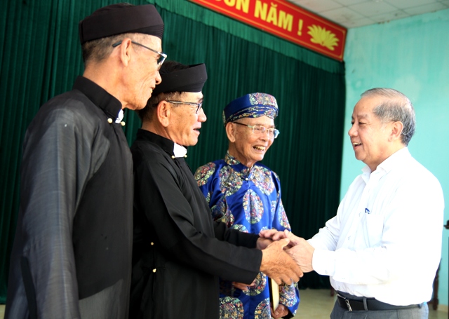 Phó Bí thư Thường trực Tỉnh ủy Phan Ngọc Thọ bắt tay, thăm hỏi các trưởng họ, trưởng tộc làng văn hóa Thai Dương Hạ