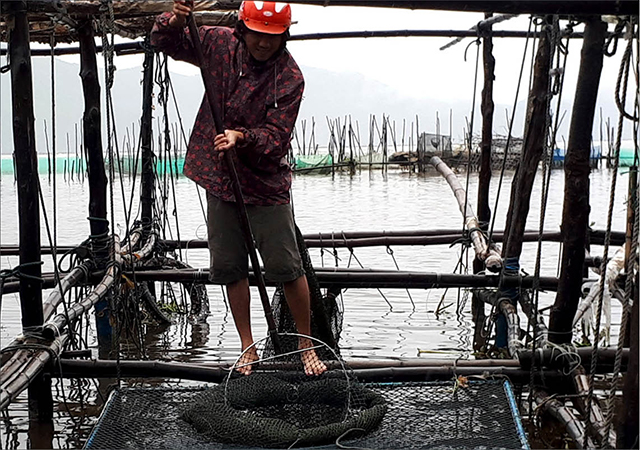 Gia cố  thu hoạch tỉa cá lồng trước lũ