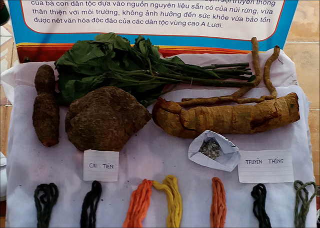 Hiện, chỉ còn rất ít bà con người dân tộc lớn tuổi biết nguồn nguyên liệu và cách nhuộm. Vì sợi nhuộm theo phương pháp truyền thống có hạn chế dễ phai màu, do đó, các em đã khôi phục lại kỹ thuật, cải tiến quá trình nhuộm sợi bằng cách sử dụng một số chất cầm màu như phèn chua, FeCl3… kết hợp với các loại cây, củ mọc tự nhiên trong rừng núi A Lưới như cây Ta-râm, củ nâu, rễ cây vàng đắng… nhằm làm cho sợi sau khi nhuộm có màu sắc tươi sáng và bền màu hơn.