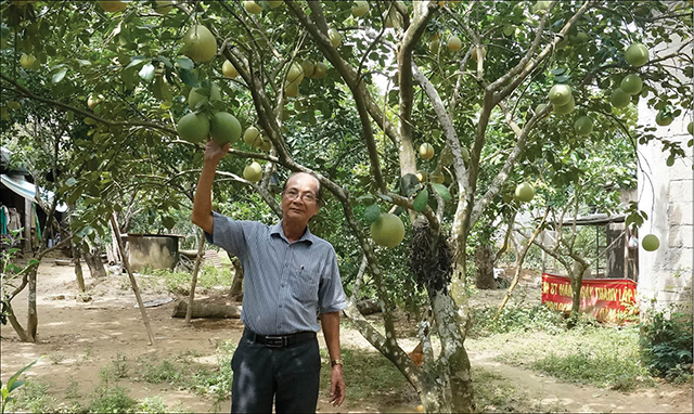 Ông Hoàng Trọng Di – Giám đốc HTX Thuỷ Biều giới tiệu vườn thanh trà của ông Lê Văn Nhân tại địa phương