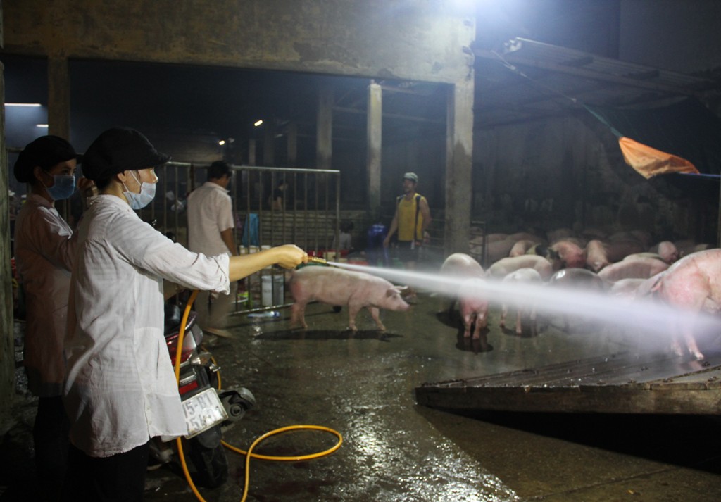 Cán bộ chăn nuôi và thú y tiêu độc khử trùng lợn trước đi đưa vào mổ tại chợ đầu mối Phú Hậu