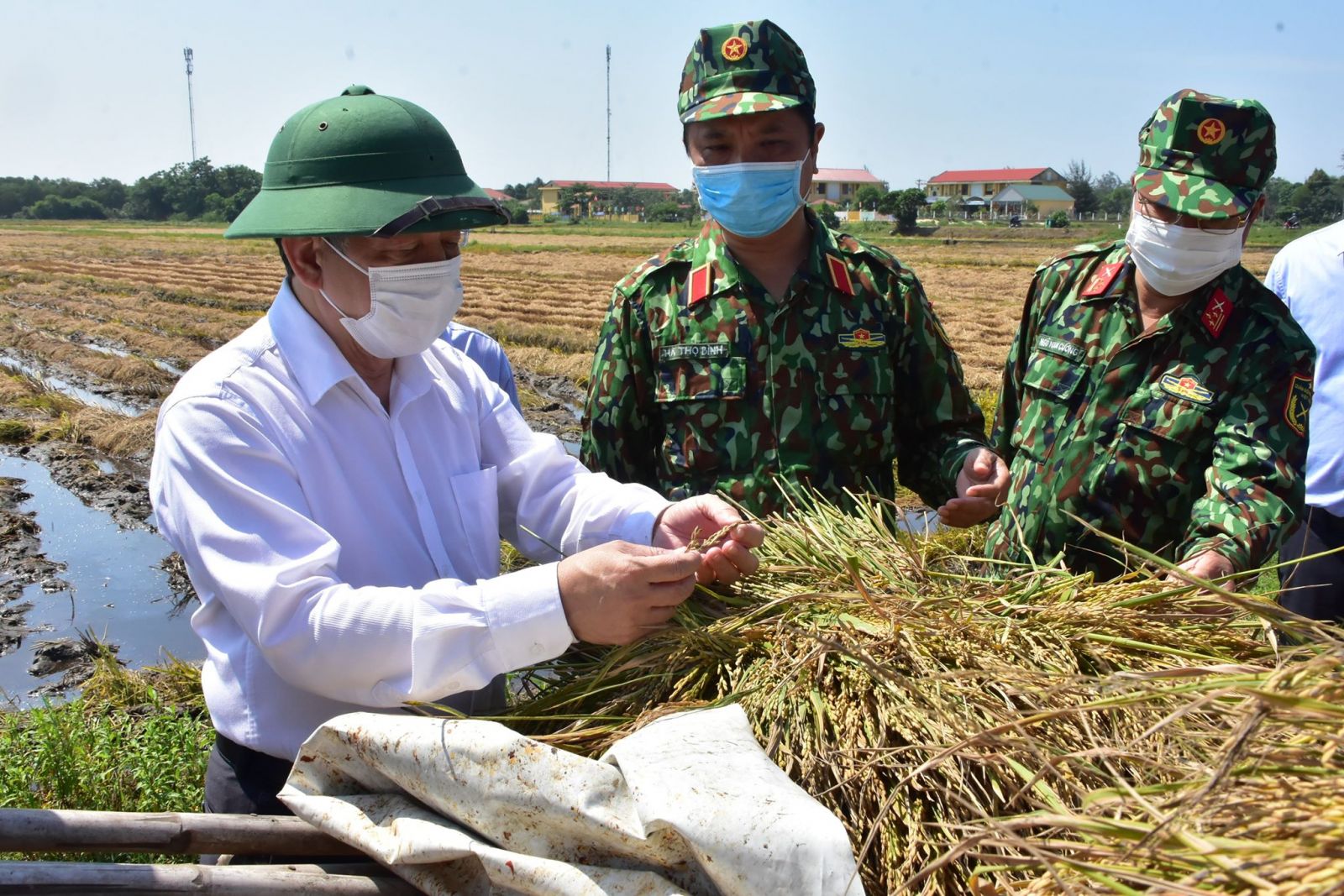 Chủ tịch UBND tỉnh Phan Ngọc Thọ hỏi thăm tình hình bà con nông dân và các chiến sĩ giúp dân gặt lúa