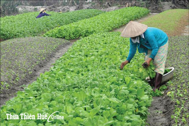 Ngoài các loại rau cải, mướp, mồng tơi, người dân đang trồng nhiều rau lang trắng. Loại rau này phù hợp với thời tiết mưa lạnh kéo dài ở Huế, cho năng suất cao, bán được giá. Bình quân mỗi hộ có thu nhập trên dưới 200 nghìn đồng/ngày từ rau. Ông Vinh cùng 9 hộ dân khác đều có diện tích 2-3 sào trồng các loại rau, củ quả trên vùng đất vừa cải tạo.