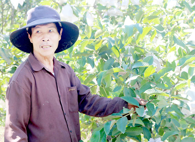 Cách đường chính hơn 3km, chúng tôi phải đi nhờ xe máy của bà con địa phương men theo con đường rừng với địa hình hiểm trở vào thăm mô hình của anh Nguyễn Quốc Triều, xã Bình Tiến. Mô hình sản xuất trên khu vực đồi rộng hơn 5 ha, gia đình anh đã tận dụng các diện tích có độ dốc ít, gần nguồn nước để đầu tư gần 3 ha các loại cây ăn quả như: cam, thanh trà, bưởi, sầu riêng, ổi; ao hồ nuôi cá và nuôi bò sinh sản.