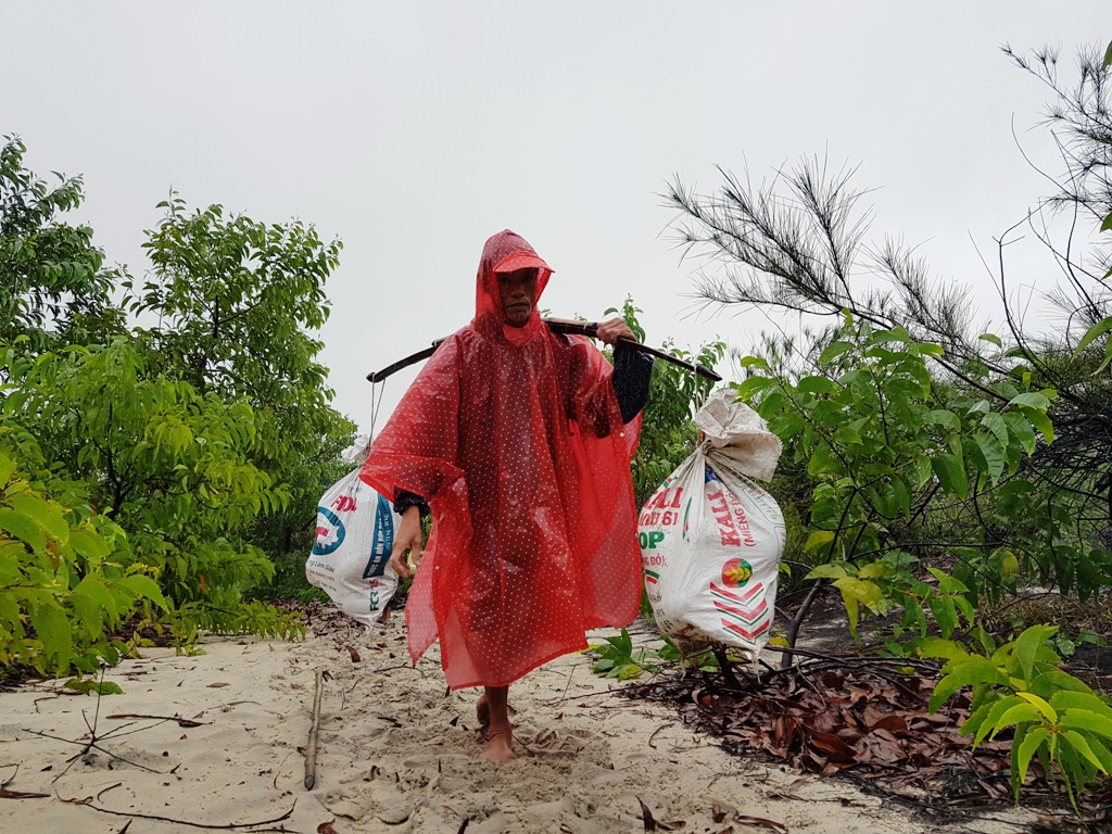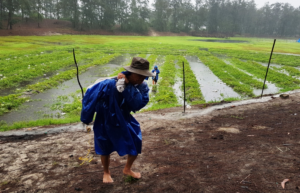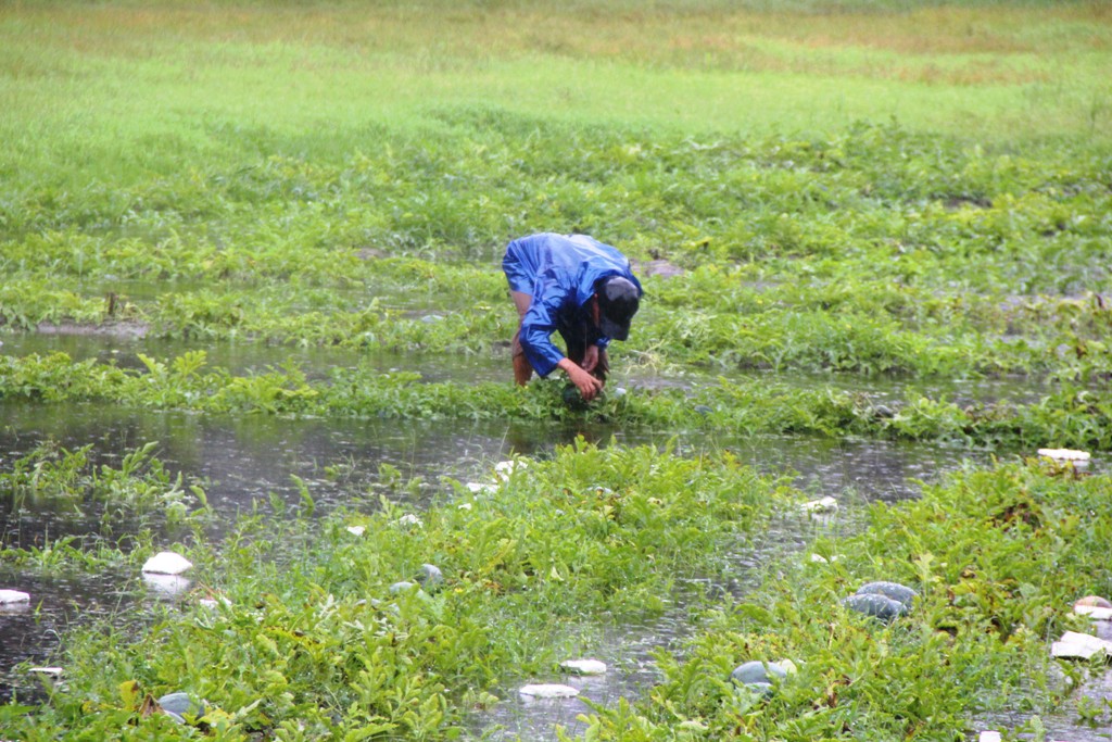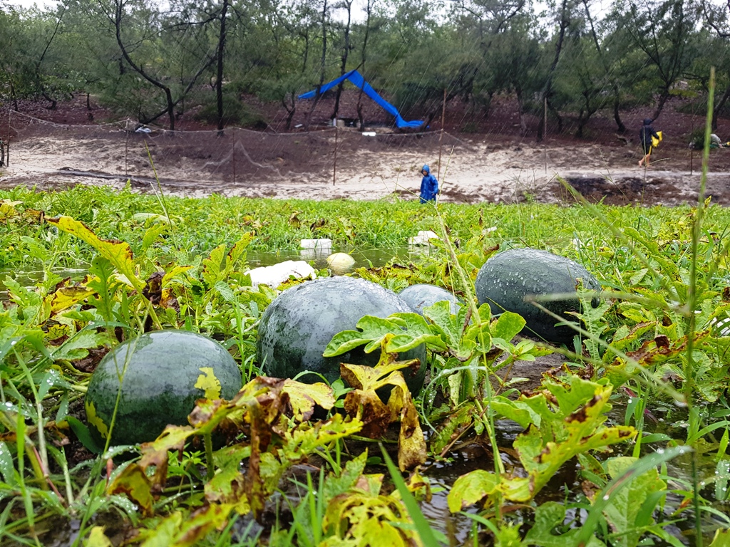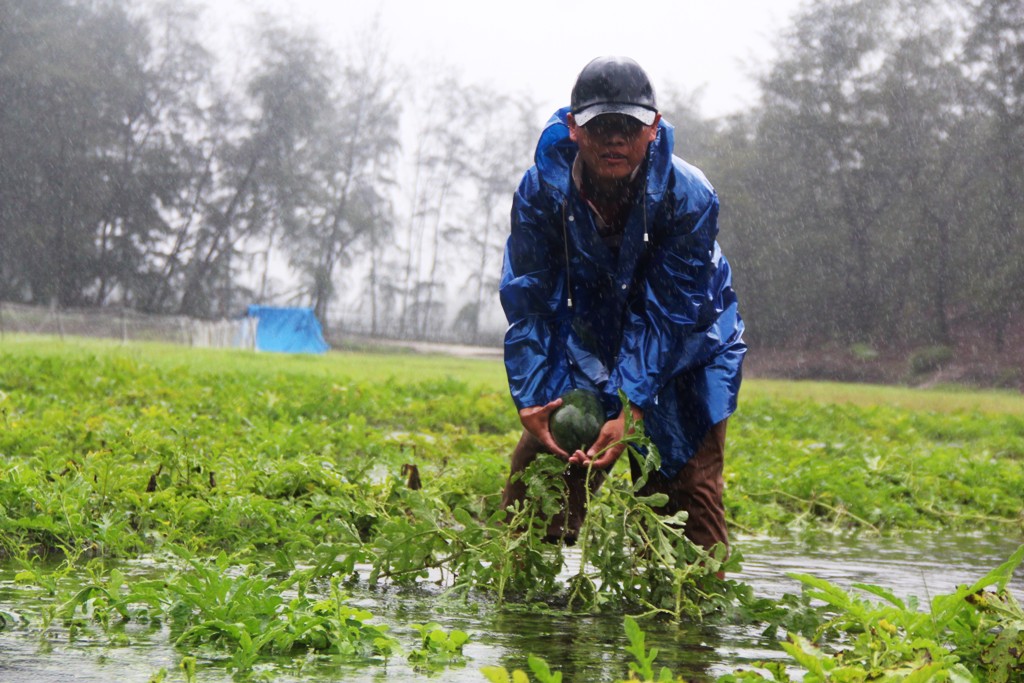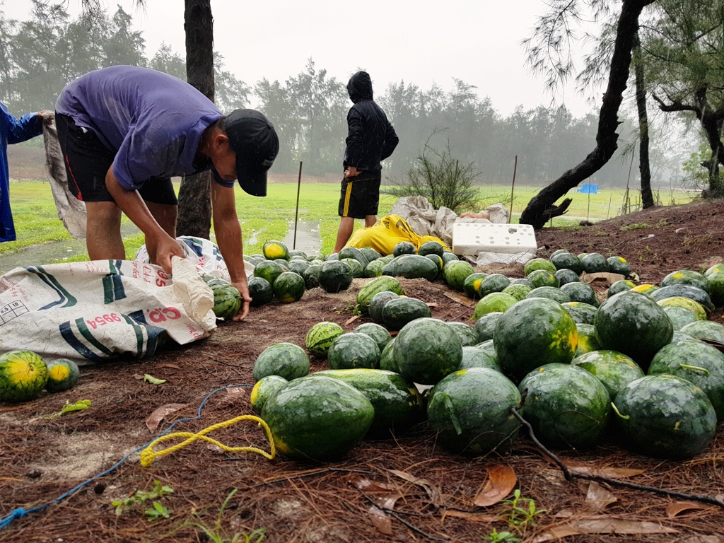 Gia đình anh Võ Thạnh trồng 500m2 dưa hấu vừa thu hoạch được khoảng 1/2 diện tích thì bị ảnh hưởng bởi mưa. Cả nhà phải ra vớt những trái dưa sắp thu hoạch lên trên các vồng cát cao, tuy nhiên do mưa liên tục, nước cao dần nên một số diện tích dưa bị hư hỏng nặng.