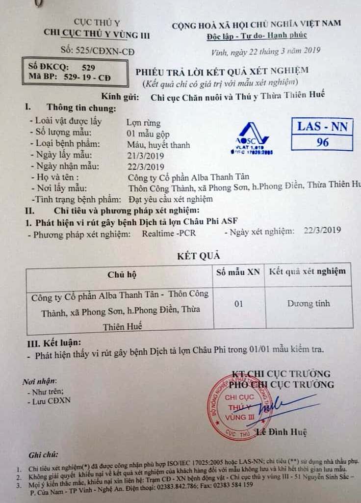 Kết quả mẫu xét nghiệm của cơ quan Thú y vùng III