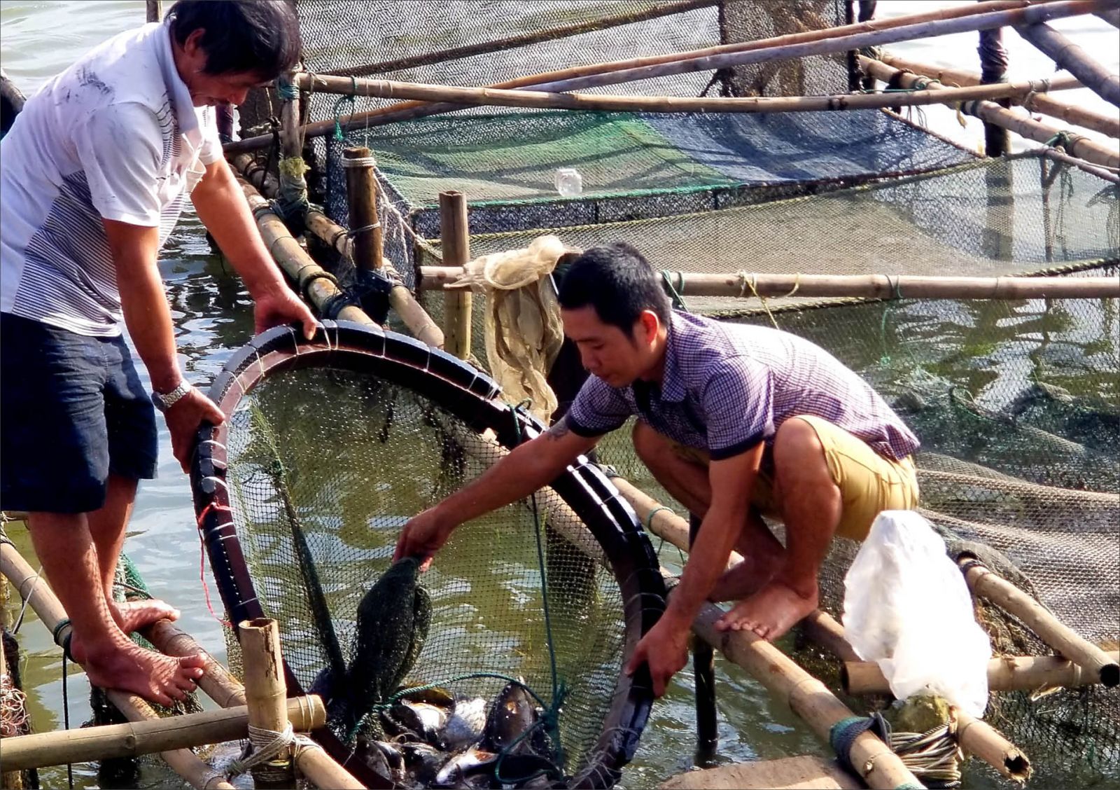 Người dân xã Vinh Hiền (huyện Phú Lộc) thu hoạch tỉa cá lồng