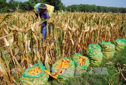 Nông dân xã Phước Hiệp, huyện Củ Chi thu hoạch ngô lai. Ảnh: Mạnh Linh/TTXVN