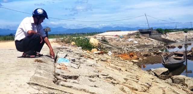 Tại đoạn đê này, bờ đê bằng đá hộc bị sóng đập nên bị sạt xuống mặt nước, mặt đê bằng bê tông với cao trình khá thấp khiến những lúc triều cường, nhiều diện tích ruộng và nuôi trồng thủy sản bị xâm nhập mặn.