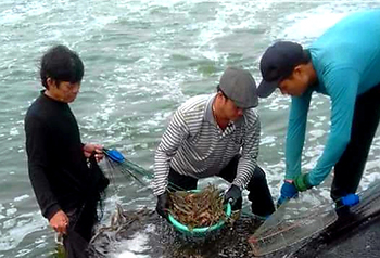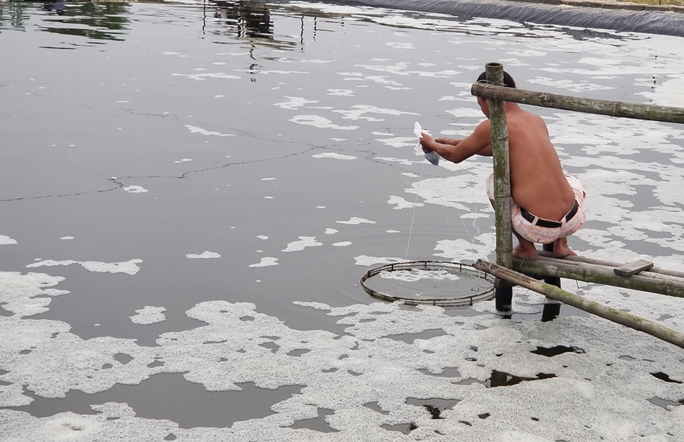 Người nuôi kiểm tra lượng thức ăn dư thừa của tôm