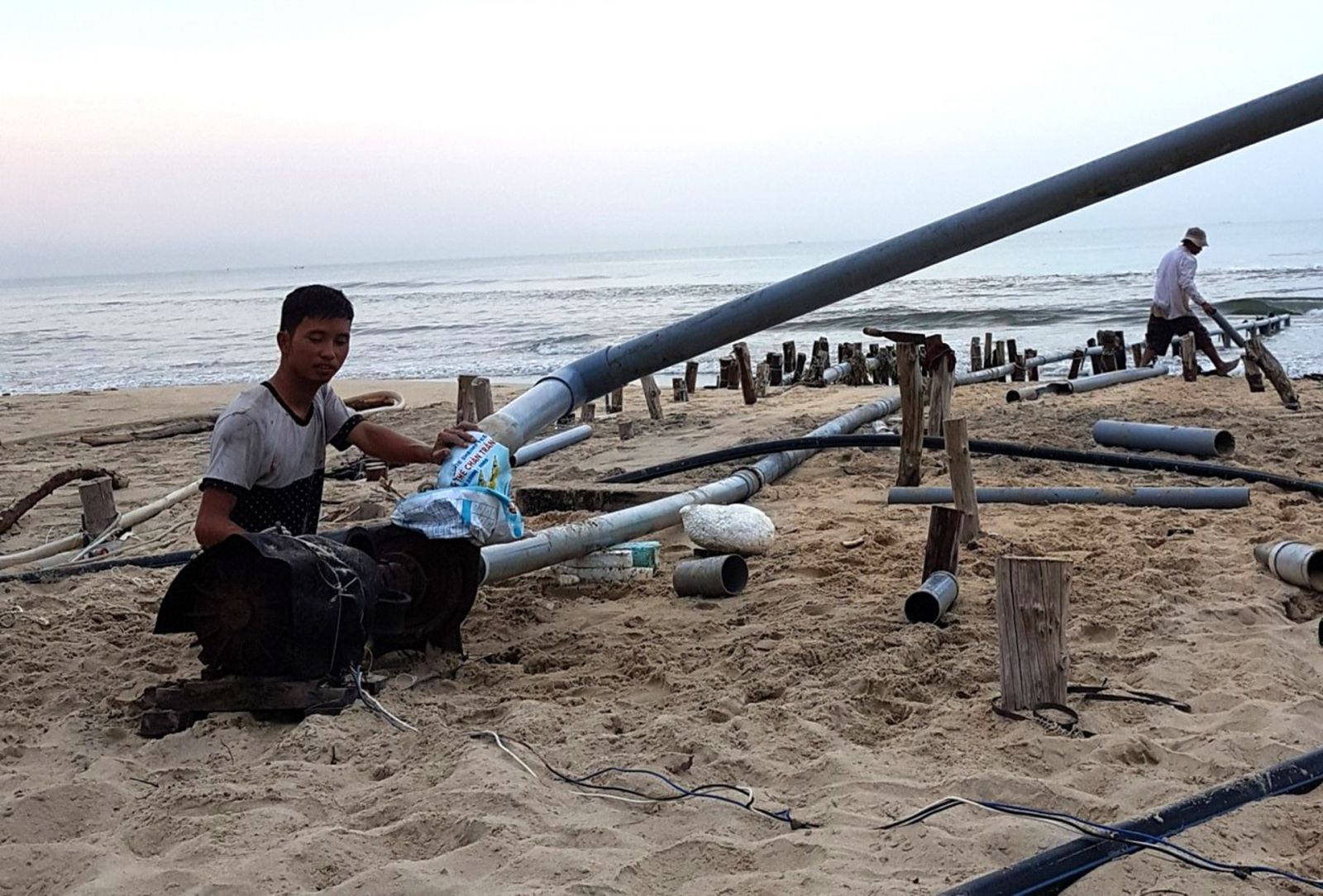 Người nuôi tôm Phú Lộc kiểm tra hệ thống đường ống cấp nước mặn
