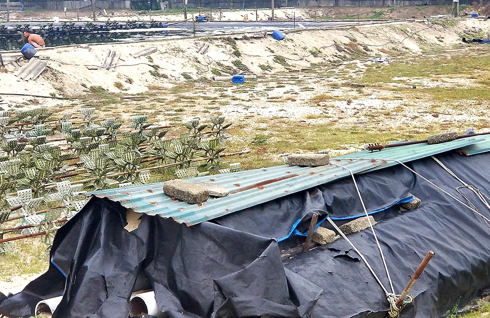 Dọc vùng cát các địa phương ven biển thời điểm này, không khó để nhận thấy “tàn tích” một thời. Nhiều hồ tôm chỉ còn là vũng đất bạc màu, trại canh của người nuôi xơ xác, tiêu điều, rêu phủ xanh tường.