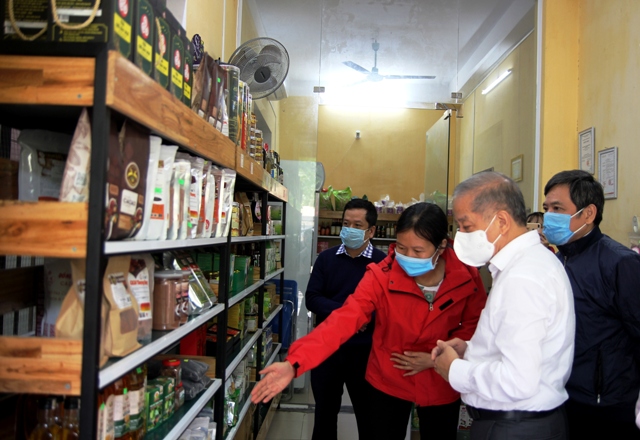 Phó Bí thư Thường trực Tỉnh ủy Phan Ngọc Thọ thăm gian hàng sản phẩm liên kết chuỗi giá trị tại trụ sở Liên minh HTX tỉnh