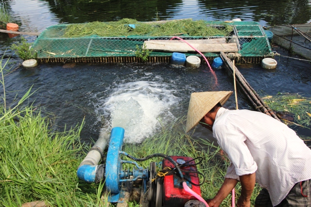 Bơm nước tạo ôxy, thông thoáng lồng nuôi được xem là giải pháp trước mắt để "cứu cá" hiện nay. Ảnh: Hà Nguyên