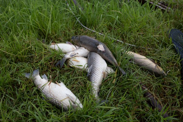 Cá chết lâu được đưa lên bãi cỏ chờ chôn. Ảnh: Trung Phan