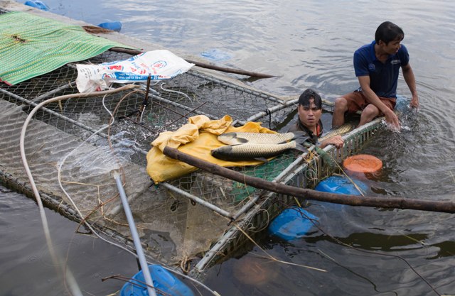 Đau lòng vứt đi cá gần trong thời điểm gần tới ngày thu hoạch. Ảnh: Trung Phan