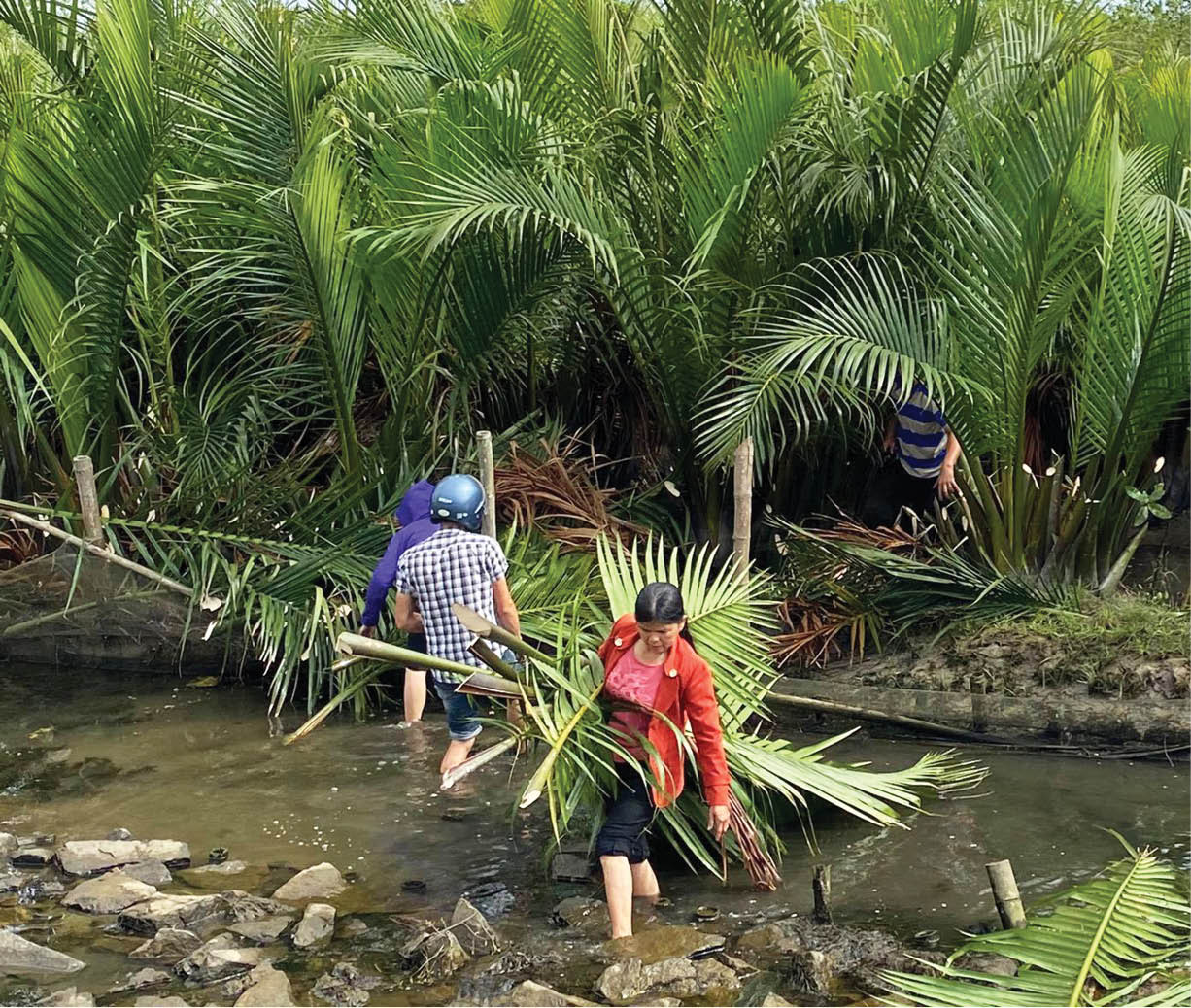 Ngư dân Ngư Mỹ Thạnh thu hoạch dừa nước bán cho HTX Thủy Lập sản xuất hàng thủ công mỹ nghệ