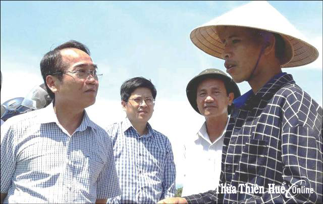 Ông Bùi Thanh Hà, Phó Bí thư Thường trực Tỉnh ủy (ngoài cùng bên trái) hỏi thăm nông dân Thủy Phù về tình hình sản xuất lúa hữu cơ
