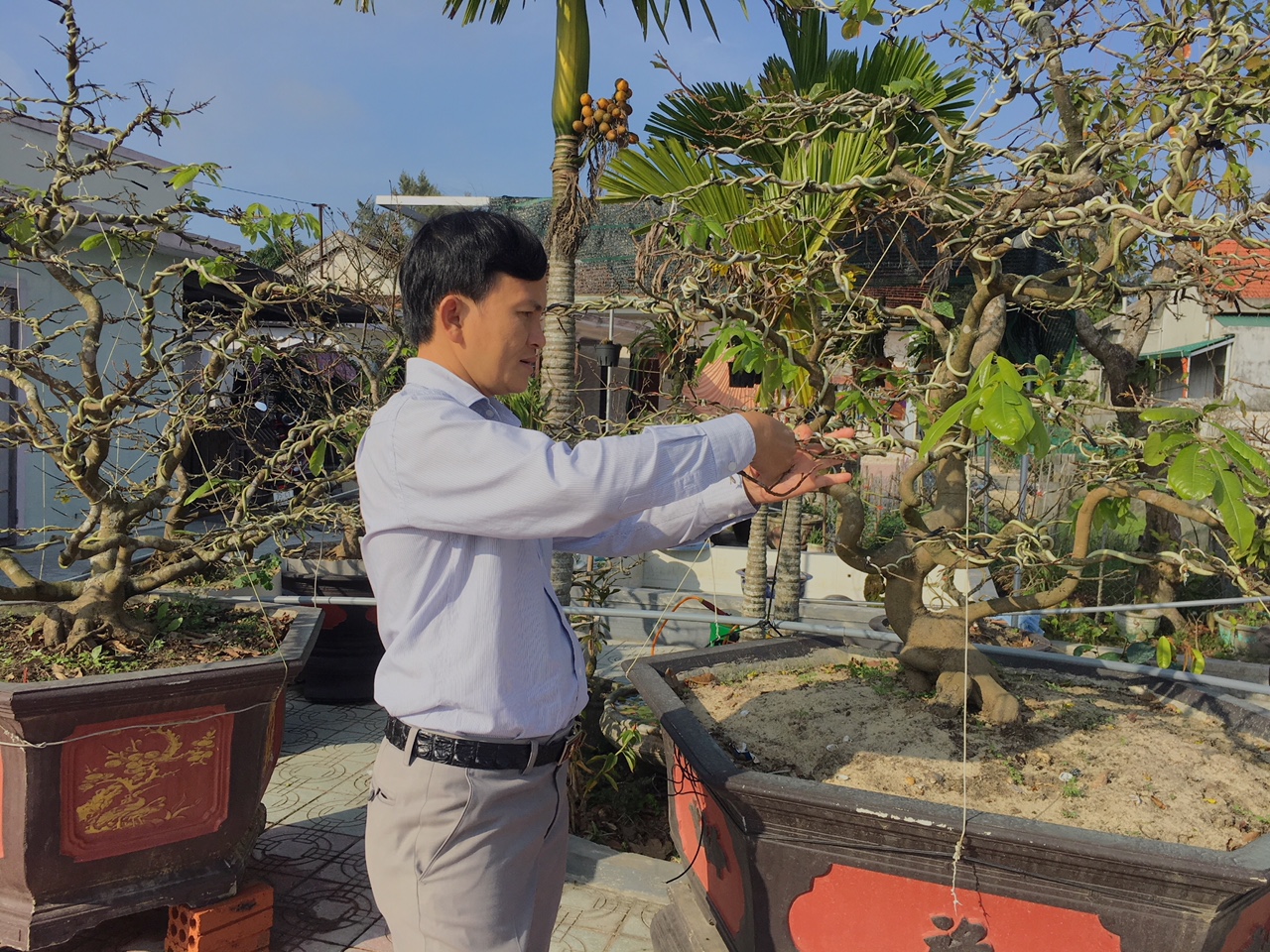 Ông Nguyễn Văn Tám chăm sóc những chậu bon sai hoàng mai