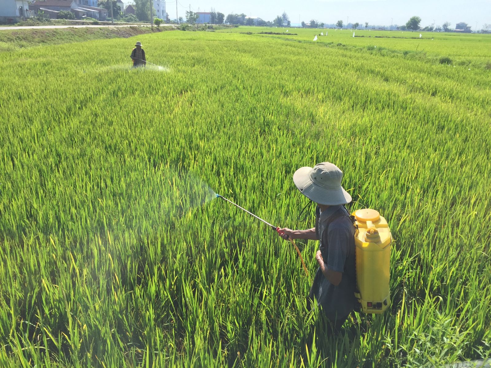 Người dân Hương Phong (TX. Hương Trà) phun thuốc phòng trừ sâu bệnh trên lúa