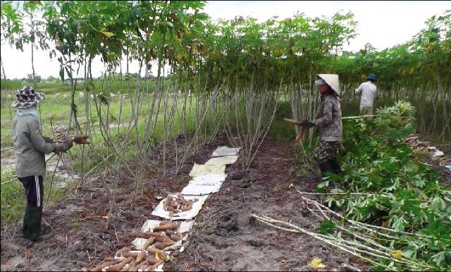 Giá sắn thương lái thu mua tại ruộng chỉ 500 -700 đồng/kg (trong ảnh: người dân Hương Văn thu hoạch sắn)