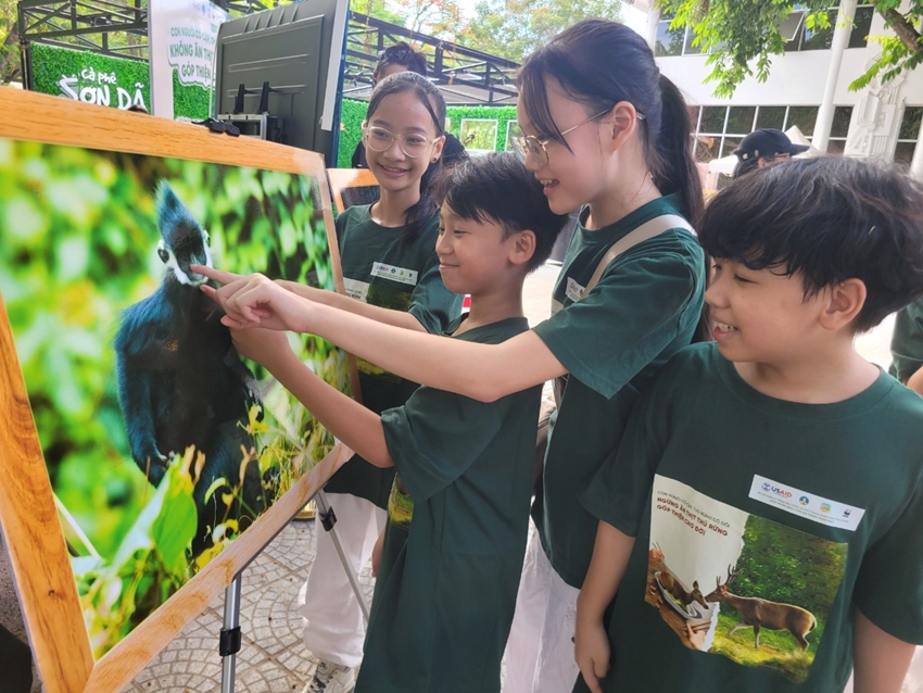 | Các em thiếu nhi thích thú với hình ảnh các loài động vật hoang dã tại triển lãm |